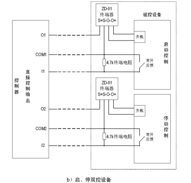 O、COM:組成直接控制輸出端,通過ZD-01終端器與負載連接,O為輸出端正極,COM為輸出端負極,啟動后O與COM之間輸出DC24V。