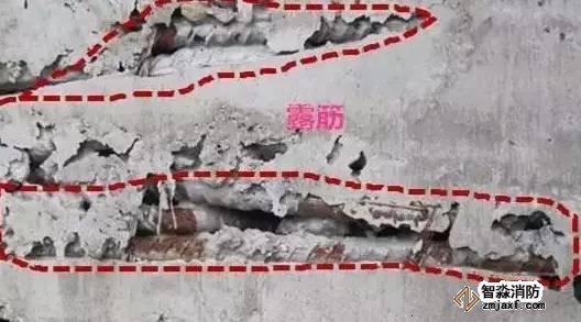 露筋即鋼筋沒有被混凝土包裹而外露。主要是由于未放墊塊或墊塊位移、鋼筋位移、結(jié)構(gòu)斷面較小、鋼筋過密等使鋼筋緊貼模板,以致混凝土保護層厚度不夠所造成的。有時也因缺邊、掉角而露筋。