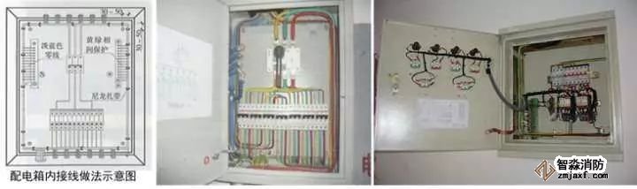 4、箱(柜)內(nèi)接線:先將線(纜)理順,按照100~200mm的間距用尼龍扎帶進行綁扎,拐角兩側30~50mm及分支處應設扎帶,按照黃色(L1)、綠色(L2)、紅色(L3)、淡藍色(N)、黃綠相間色(PE)分別接入A相、B相、C相、N線、PE線端子上,多股線應壓接線端子;標識:應在N、PE端子排附近刻寫或粘貼“N"、“PE”標識,進入配電盤的外部回路應扎回路牌,進入配電盤的控制線在導線套上號碼管;接地:配電箱(柜)的接地螺栓、箱門上的接地螺栓、電源進線回路的PE線、配電箱饋出各個回路的PE線、與配電箱連接金屬導管均應PE端子直接連接,導通良好。