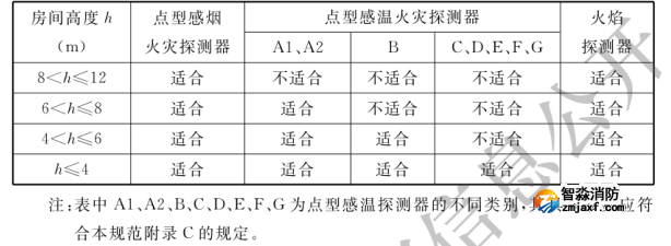 5.2.1 對(duì)不同高度的房間,可按表5.2.1選擇點(diǎn)型火災(zāi)探測(cè)器。