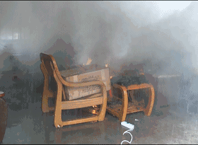 (實(shí)驗(yàn)畫(huà)面顯示,火災(zāi)發(fā)生后,獨(dú)立感煙探測(cè)器開(kāi)始報(bào)警,簡(jiǎn)易噴淋開(kāi)始噴水)