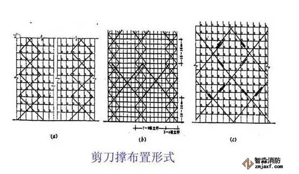 ⒊剪刀撐:四角應(yīng)設(shè)抱角斜撐,四邊設(shè)剪刀撐,中間每隔四排立桿沿縱向設(shè)一道剪刀撐,斜撐和剪刀撐均應(yīng)由下而上連續(xù)設(shè)置。