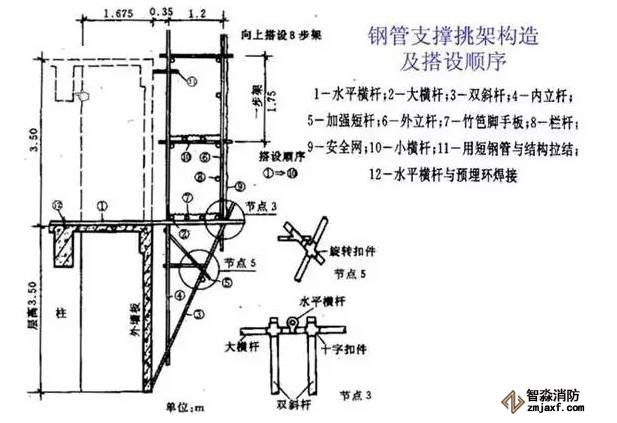 2、利用型鋼擱置在樓層內(nèi)作為底座(樓面擱置長(zhǎng)度大于1.5米,樓層內(nèi)預(yù)埋2道圓鋼錨固型鋼)搭設(shè)鋼管腳手架,同時(shí)用剛纜斜拉,高度不超過24米或8層。(個(gè)人認(rèn)為也有浪費(fèi)嫌疑,完全可以通過計(jì)算定下型鋼和圓鋼規(guī)格,不考慮斜拉。不過安全系數(shù)高,可以考慮)