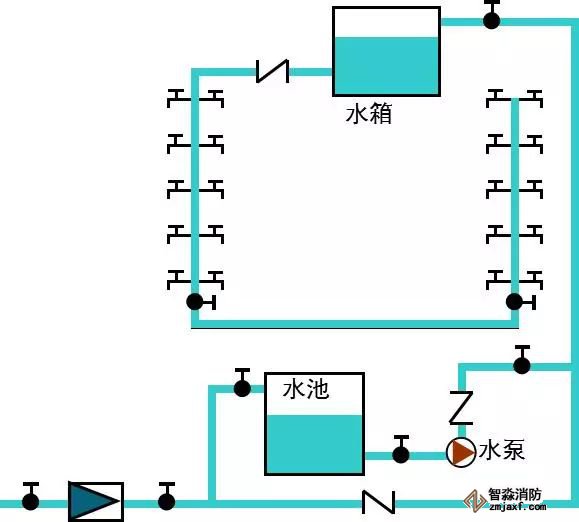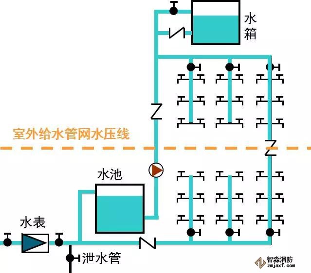 (3)設(shè)有貯水池、水箱和水泵的給水方式