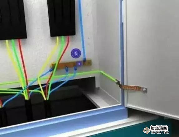 6、黃、綠、紅三相線分別從分配電箱的分路隔離開關(guān)引出,從N板接線端子引出淡藍色的工作零線,從PE板接線端子引出黃綠雙色保護零線。