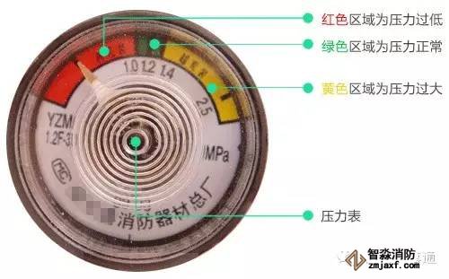 2、儲壓式滅火器壓力符合要求,壓力表指針在綠區(qū);