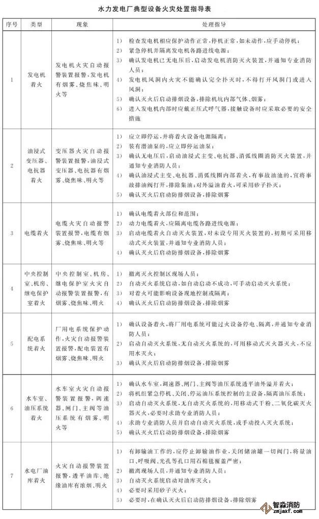 5、水力發(fā)電廠(chǎng)發(fā)生火災(zāi)時(shí),值班人員應(yīng)及時(shí)進(jìn)行火災(zāi)處置并報(bào)警,相關(guān)設(shè)備的火災(zāi)處置參見(jiàn)下表。