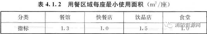 1、飲食或餐飲建筑可根據(jù)用餐區(qū)域的每座最小面積計(jì)算安全疏散人數(shù),用餐區(qū)域每座最小使用面積宜符合表4.1.2的規(guī)定。(4.1.2)