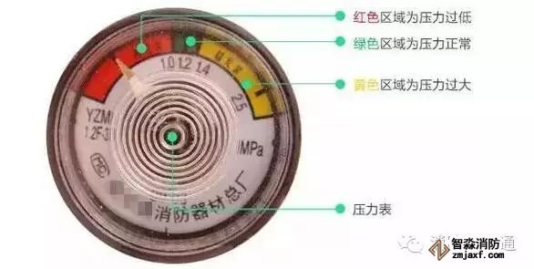 2、儲(chǔ)壓式滅火器壓力符合要求,壓力表指針在綠區(qū);