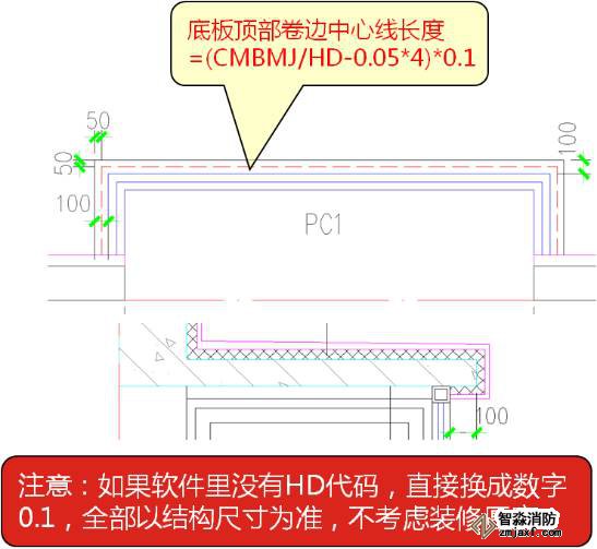 估計(jì)很多朋友看不懂“(CMBMJ/HD-0.05*4*0.1”,我解釋下,CMBMJ是飄窗底板側(cè)面模板面積,除以HD(厚度)就是側(cè)面長(zhǎng)度,減去0.05*4就是我們要求底板裝修上翻的中心線長(zhǎng)度,在乘以0.1就是上翻的面積。