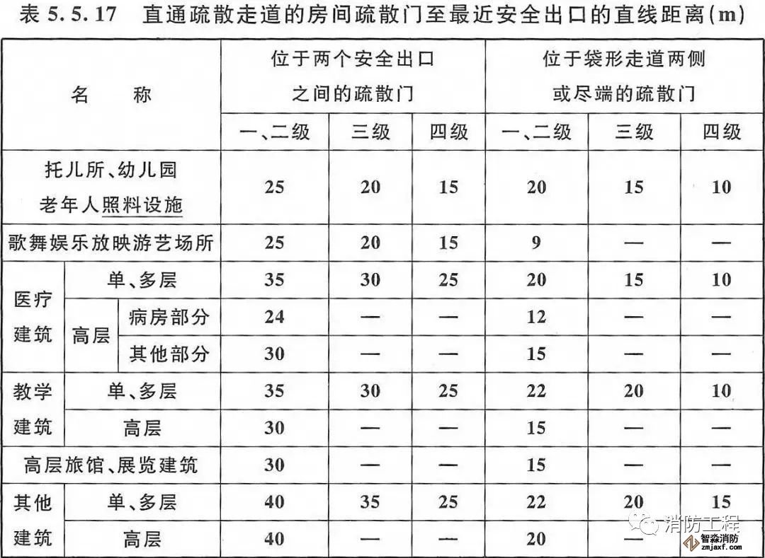 (2)敞開樓梯間:兩個(gè)安全出口之間-5m,袋形走道兩側(cè)或盡端-2m;