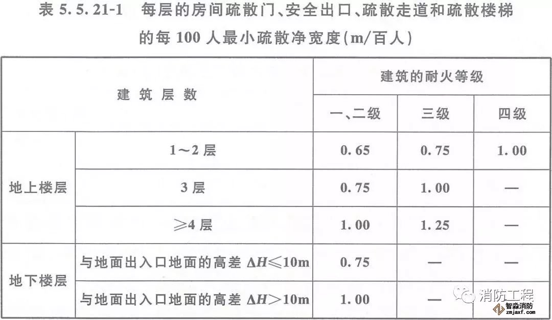 每層的房間疏散門、安全出口、疏散走道和疏散樓梯的各自總凈寬度,應(yīng)根據(jù)疏散人數(shù)按每100人的最小疏散凈寬度不小于表5.5.21-1的規(guī)定計(jì)算確定。