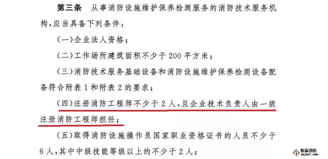8月29日,應(yīng)急管理部發(fā)布《消防技術(shù)服務(wù)機(jī)構(gòu)從業(yè)條件》的通知,明確要求:從事消防設(shè)施維護(hù)保養(yǎng)檢測服務(wù)的消防技術(shù)服務(wù)機(jī)構(gòu),注冊(cè)消防工程師數(shù)量不少于2人,且企業(yè)技術(shù)負(fù)責(zé)人由一級(jí)消防工程師擔(dān)任。