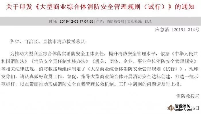 12月3日,應(yīng)急管理部消防救援局印發(fā)《大型商業(yè)綜合體消防安全管理規(guī)則(試行)》的通知。第十二條明確:消防安全管理人對(duì)消防安全責(zé)任人負(fù)責(zé),應(yīng)當(dāng)具備與其職責(zé)相適應(yīng)的消防安全知識(shí)和管理能力,取得注冊(cè)消防工程師執(zhí)業(yè)資格或者工程類中級(jí)以上專業(yè)技術(shù)職稱。