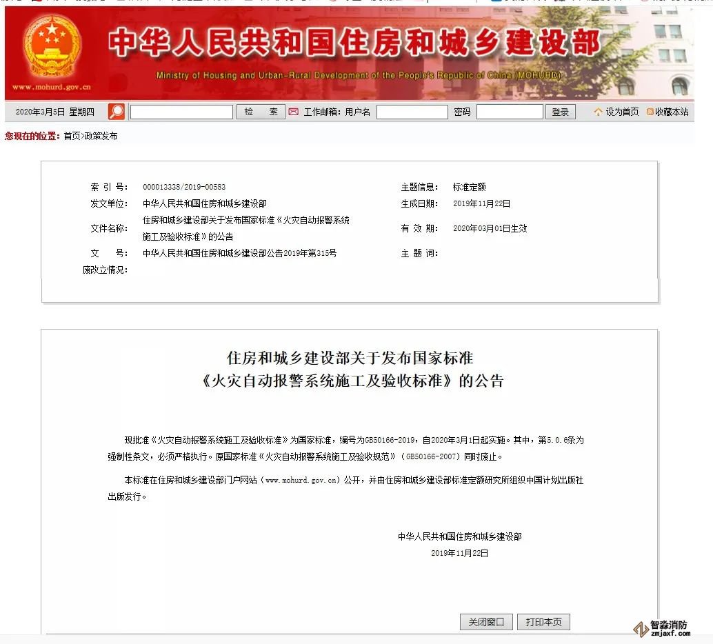 近日,住房和城鄉(xiāng)建設(shè)部發(fā)布公告,批準(zhǔn)《火災(zāi)自動報警系統(tǒng)施工及驗(yàn)收標(biāo)準(zhǔn)》為國家標(biāo)準(zhǔn),編號為GB50166-2019,自2020年3月1日起實(shí)施。原國家標(biāo)準(zhǔn)《火災(zāi)自動報警系統(tǒng)施工及驗(yàn)收規(guī)范》(GB50166-2007)同時廢止。