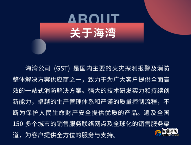 海灣公司(GST)是國(guó)內(nèi)主要的火災(zāi)探測(cè)報(bào)警及消防整體解決方案供應(yīng)商之一,致力于為廣大客戶提供全面高效的一站式消防解決方案。強(qiáng)大的技術(shù)研發(fā)實(shí)力和持續(xù)創(chuàng)新能力,卓越的生產(chǎn)管理體系和嚴(yán)謹(jǐn)?shù)馁|(zhì)量控制流程,不斷為保護(hù)人民生命財(cái)產(chǎn)安全提供優(yōu)質(zhì)的產(chǎn)品。遍及全國(guó)150 多個(gè)城市的銷售服務(wù)聯(lián)絡(luò)網(wǎng)點(diǎn)及全球化的銷售服務(wù)渠道,為客戶提供全方位的服務(wù)與支持。