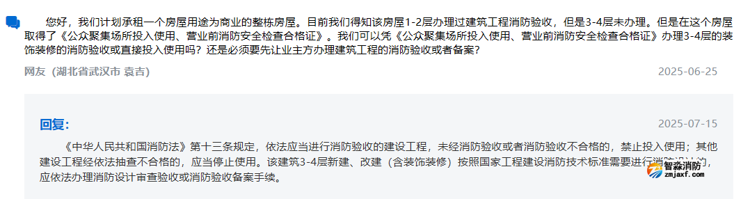 咨詢:您好,我們計劃承租一個房屋用途為商業(yè)的整棟房屋。目前我們得知該房屋1-2層辦理過建筑工程消防驗收,但是3-4層未辦理。但是在這個房屋取得了《公眾聚集場所投入使用、營業(yè)前消防安全檢查合格證》。我們可以憑《公眾聚集場所投入使用、營業(yè)前消防安全檢查合格證》辦理3-4層的裝飾裝修的消防驗收或直接投入使用嗎?還是必須要先讓業(yè)主方辦理建筑工程的消防驗收或者備案?