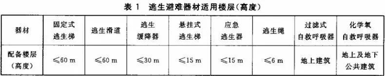 (1)逃生滑道、固定式逃生梯應(yīng)配備在不高于60m的樓層內(nèi);逃生緩降器應(yīng)配備在不高于30m的樓層內(nèi);懸掛式逃生梯、應(yīng)急逃生器應(yīng)配備在不高于15m的樓層內(nèi);逃生繩應(yīng)配備在不高于6m的樓層內(nèi)。地上建筑可配備過濾式自救呼吸器或化學(xué)氧自救呼吸器,高于30m的樓層內(nèi)應(yīng)配備防護(hù)時間不少于20min的自救呼吸器。地下建筑應(yīng)配備化學(xué)氧自救呼吸器。逃生避難器材配備樓層(高度)見下表。