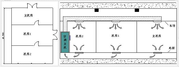 如下圖所示,若三個(gè)房間從吊頂?shù)降匕宥疾捎锚?dú)立的空調(diào)系統(tǒng),那么將機(jī)房1和機(jī)房2劃作一個(gè)區(qū)域或劃為兩個(gè)單獨(dú)滅火區(qū)都是可行的。但如果采用一臺(tái)精密空調(diào)為三個(gè)房間服務(wù)且為“上送風(fēng),地板下回風(fēng)”方式這三個(gè)房間就必須劃分成一個(gè)滅火區(qū)域,藥劑儲(chǔ)備應(yīng)該是上者的3倍或1.5倍,對(duì)工程的投資影響是比較大的。除過(guò)滅火劑和噴放管道布置要作為一個(gè)保護(hù)區(qū)考慮外,探測(cè)范圍也應(yīng)該分塊進(jìn)行探測(cè)但還是一個(gè)探測(cè)區(qū)域,警報(bào)區(qū)域也應(yīng)該按照一個(gè)區(qū)域來(lái)設(shè)置和聯(lián)動(dòng)。