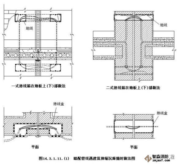 管路在通過建筑物的變形縫時,應(yīng)加裝管路補償裝置。管路補償裝置是在變形縫的兩側(cè)對稱預(yù)埋一個接線盒,用一根短管將兩接線盒相鄰面連接起來,短管的一端與一個盒子固定牢固,另一端伸入另一盒內(nèi),且此盒上的相應(yīng)位置的孔要開長孔,長孔的長度不小于管徑的2倍。如果該補償裝置在同一軸線墻體上,則可有拐角箱作為補償裝置,如不在同一軸線上則可用直筒式接線箱進行補償。做法可參照圖143111?(1)?(2)。也可采用防水型可撓金屬電線管跨越兩側(cè)接線箱盒并留有適當(dāng)余量。