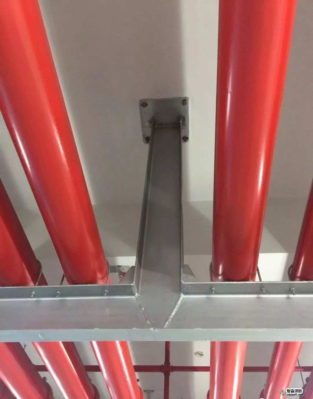 支吊架在梁上生根,焊接轉(zhuǎn)角處采用鋼板補(bǔ)強(qiáng)。