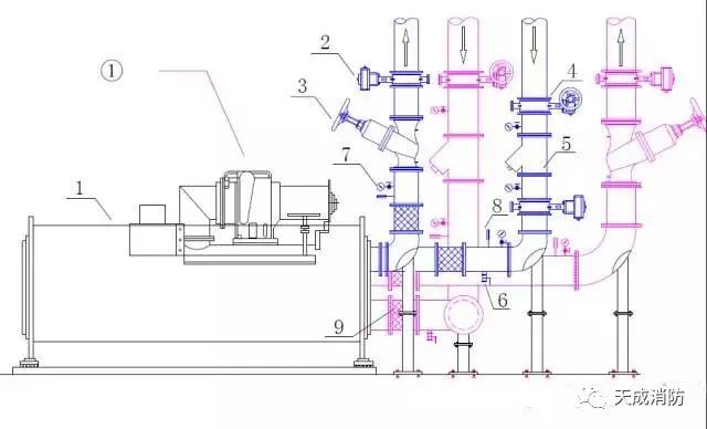 冷水機(jī)組常規(guī)接管圖:1-冷水機(jī)組,2-電動(dòng)閥,3-平衡閥,4-蝶閥,5-Y 型過(guò)濾器,6-泄水閥,7-壓力表,8-溫度計(jì),9-軟接頭。