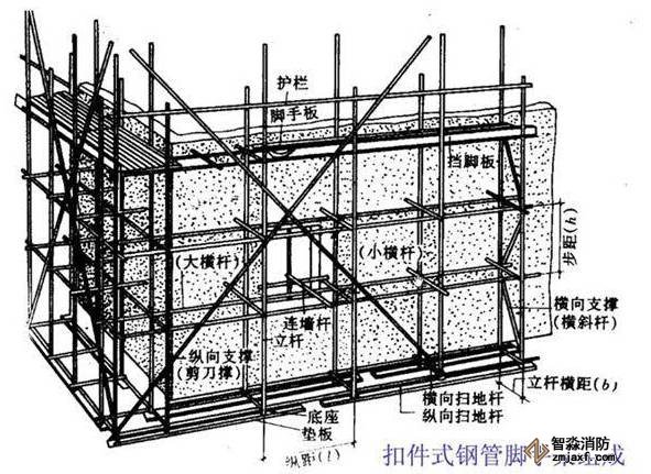 ⒊剪刀撐:四角應(yīng)設(shè)抱角斜撐,四邊設(shè)剪刀撐,中間每隔四排立桿沿縱向設(shè)一道剪刀撐,斜撐和剪刀撐均應(yīng)由下而上連續(xù)設(shè)置。