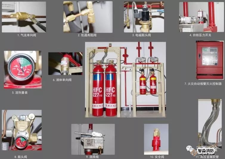 滅火系統(tǒng)主要由自動(dòng)報(bào)警滅火控制系統(tǒng)、滅火劑儲(chǔ)瓶、瓶頭閥、啟動(dòng)氣體儲(chǔ)瓶、電磁瓶頭閥、選擇閥、稱重裝置、單向閥、壓力開關(guān)、框架、噴嘴、管道等設(shè)備組成。