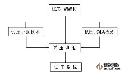 試壓時成立專門的試壓小組,試壓小組設(shè)組長一人,試壓時聽從組長指揮,試壓組織方塊圖如下: