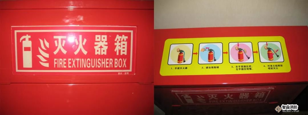 設(shè)置要求:在滅火器箱體正面中上部應(yīng)設(shè)置自發(fā)光式“滅火器箱”標(biāo)牌,在箱體上方張貼操作方法圖例,圖例大小420×140mm。