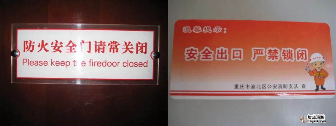 設(shè)置要求:在防火門中上部應(yīng)設(shè)置防火門保持常閉標(biāo)牌,以及禁止占用等警示標(biāo)語。