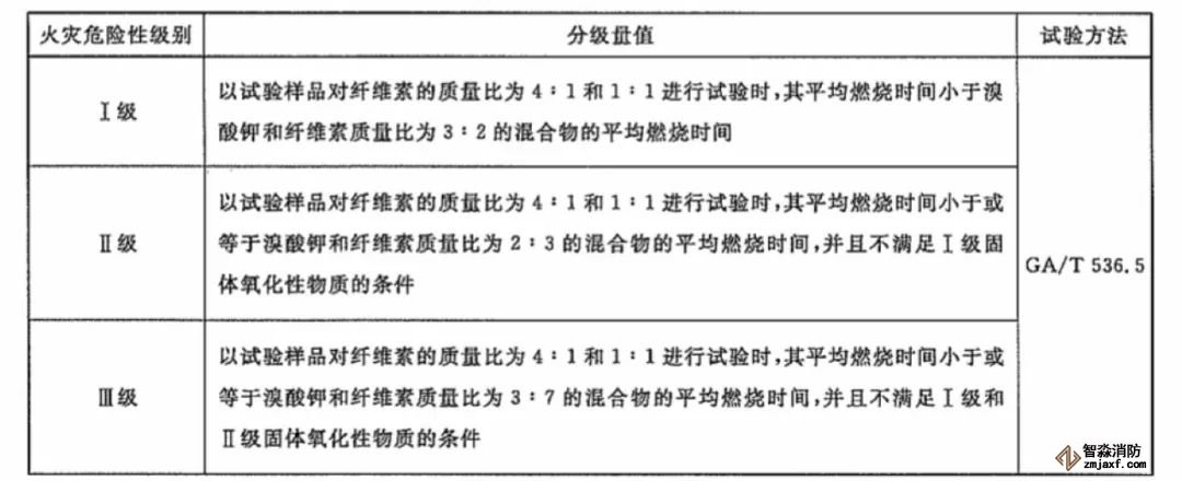 固體氧化性物質(zhì)火災(zāi)危險(xiǎn)性分級(jí)方法見下表: