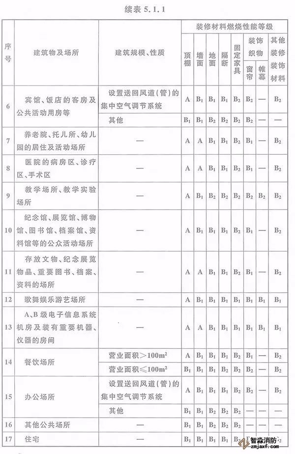 5.1.1 單層、多層民用建筑內(nèi)部各部位裝修材料的燃燒性能等級,不應(yīng)低于本規(guī)范表5.1.1的規(guī)定。
