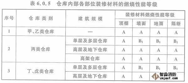 6.0.5 倉庫內(nèi)部各部位裝修材料的燃燒性能等級,不應(yīng)低于本規(guī)范表6.0.5的規(guī)定。