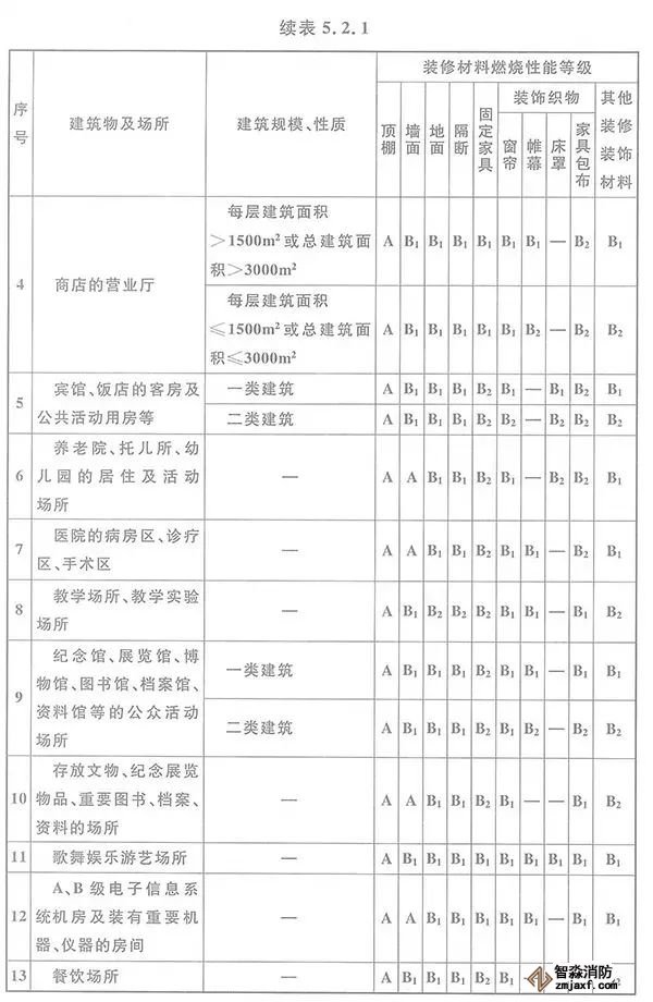 5.2.1 高層民用建筑內(nèi)部各部位裝修材料的燃燒性能等級,不應(yīng)低于本規(guī)范表5.2.1的規(guī)定。