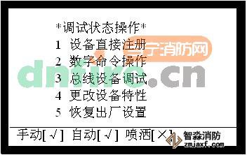 按下“系統(tǒng)設(shè)置”按鍵,在系統(tǒng)設(shè)置操作狀態(tài)下,鍵入“6”,便進入調(diào)試操作狀態(tài),如圖2所示。調(diào)試狀態(tài)提供了設(shè)備直接注冊、數(shù)字命令操作、總線設(shè)備調(diào)試、更改設(shè)備特性、恢復(fù)出廠設(shè)置五種操作。
