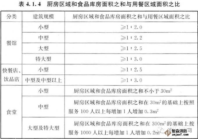 一、廚房區(qū)域和食品庫(kù)房面積之和與用餐區(qū)域面積之比宜符合表4.1.4的規(guī)定。(4.1.4)