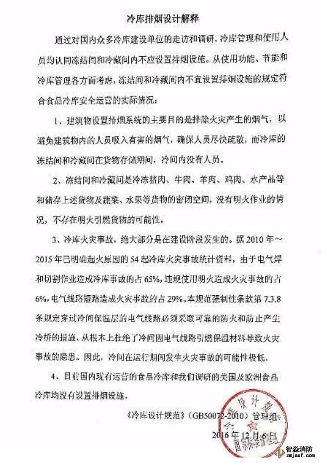 《冷庫(kù)設(shè)計(jì)規(guī)范》管理組復(fù)函:冷庫(kù)排煙設(shè)計(jì)解釋!