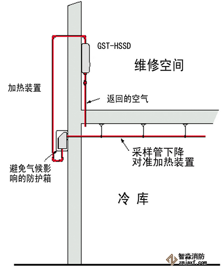 冷庫中采樣管,加熱箱和吸氣式感煙火災(zāi)探測器的相對位置