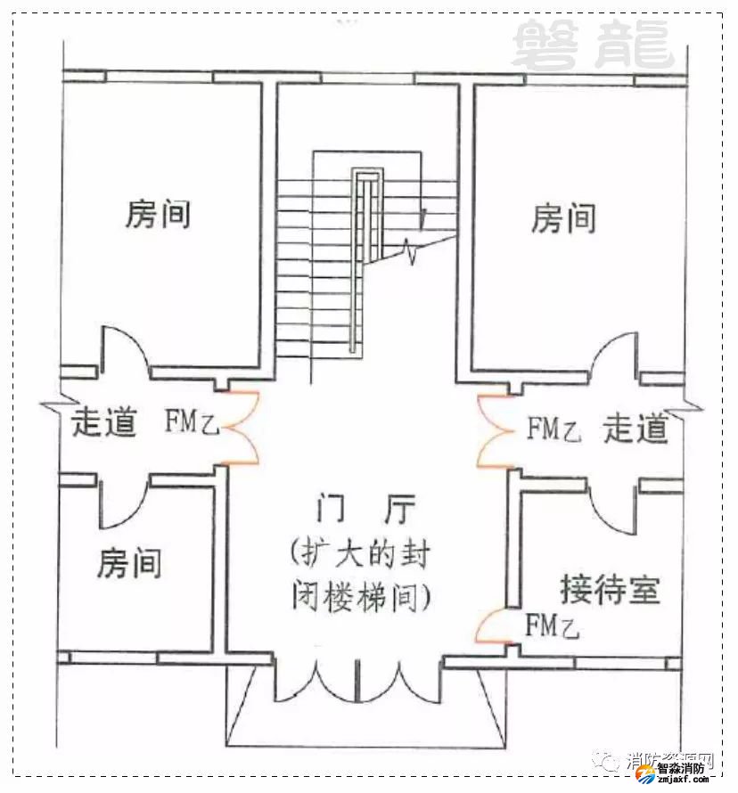 樓梯間的首層可將走道和門(mén)廳等包括在樓梯間內(nèi)形成擴(kuò)大的封閉樓梯間,但應(yīng)采用乙級(jí)防火門(mén)等與其他走道和房間分隔。