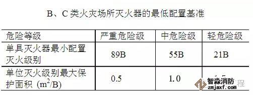 新規(guī)范規(guī)定:B、C類火災(zāi)配置場所的最低配置基準(zhǔn)是單具滅火器最小配置滅火級別為: 嚴(yán)重危險級為89B, 中危險級為55B, 輕危險級為21B,;