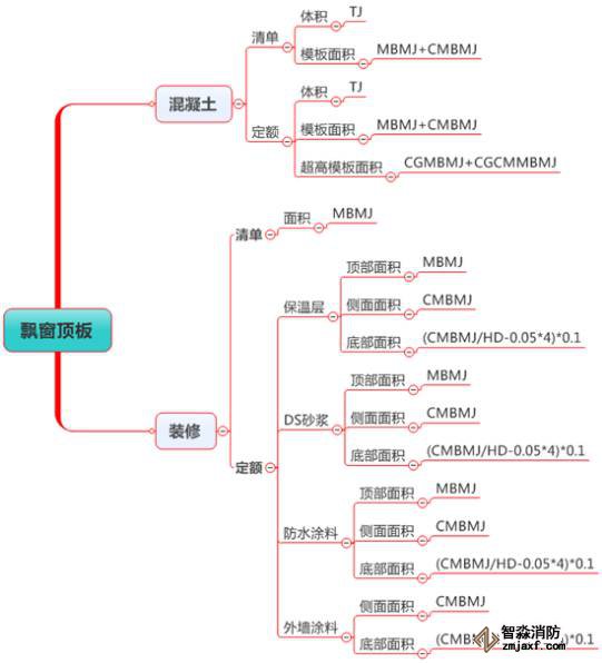 估計(jì)很多朋友看不懂“(CMBMJ/HD-0.05*4*0.1”,我解釋下,CMBMJ是飄窗底板側(cè)面模板面積,除以HD(厚度)就是側(cè)面長(zhǎng)度,減去0.05*4就是我們要求底板裝修上翻的中心線長(zhǎng)度,在乘以0.1就是上翻的面積。