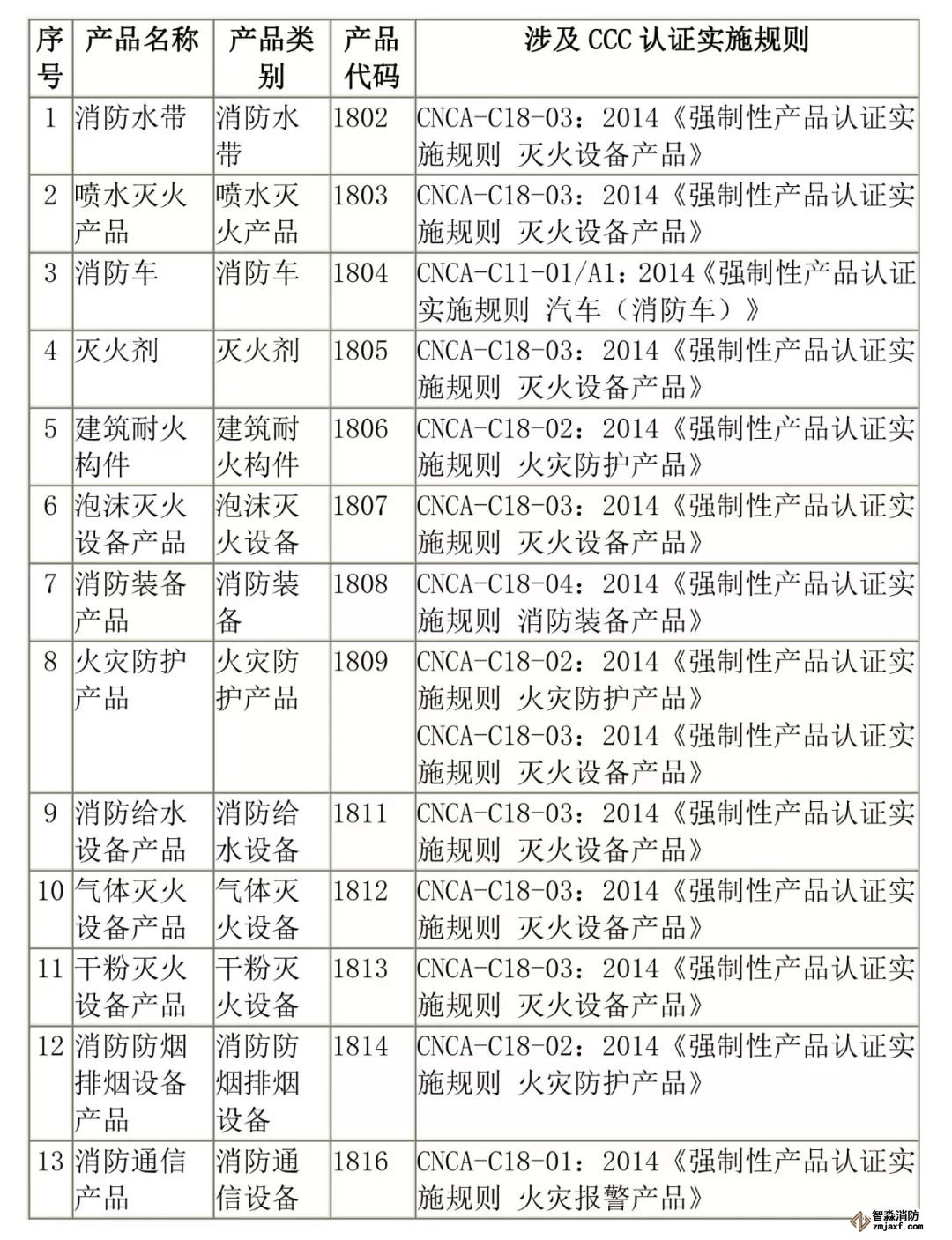 為貫徹落實(shí)黨中央、國務(wù)院關(guān)于深化消防執(zhí)法改革的決策部署,市場(chǎng)監(jiān)管總局會(huì)同應(yīng)急管理部對(duì)消防產(chǎn)品強(qiáng)制性認(rèn)證目錄作出調(diào)整。現(xiàn)將有關(guān)事項(xiàng)公告如下: