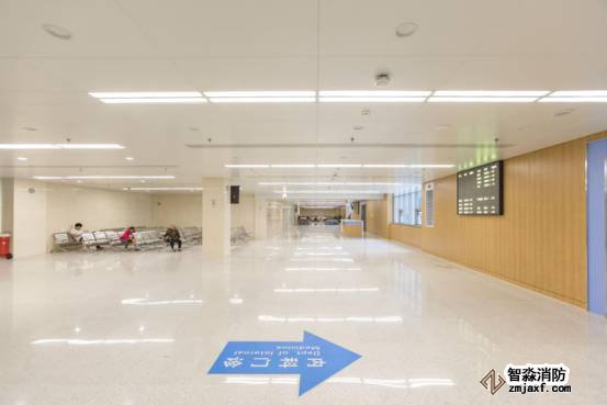 診室候診區(qū)燈具、噴頭、風(fēng)口、煙感排布精細(xì)美觀,橫成排、豎成行、斜成線,錯(cuò)落有致。
