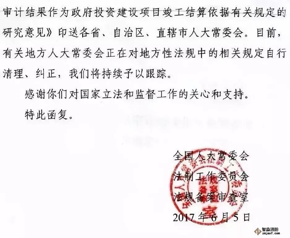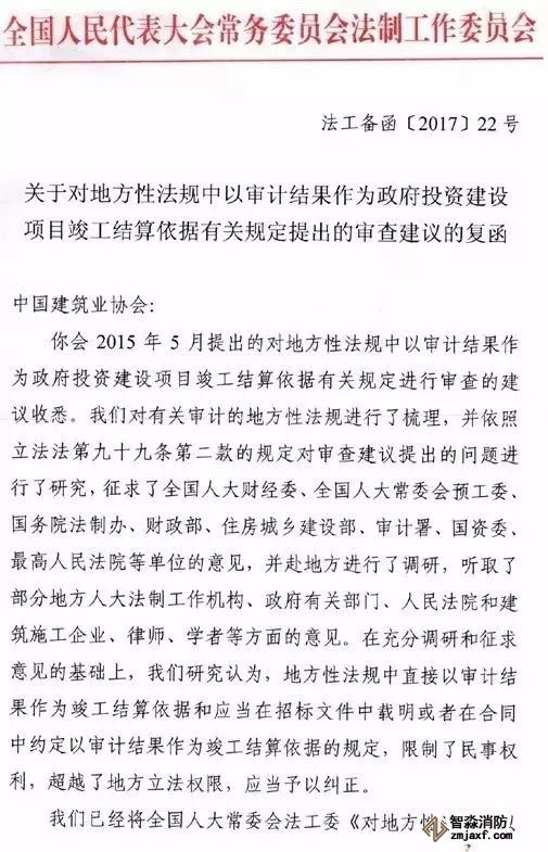 全國人大常委會法工委在回復(fù)中國建筑業(yè)協(xié)會《關(guān)于對地方性法規(guī)中以審計結(jié)果作為政府投資建設(shè)項目竣工結(jié)算依據(jù)有關(guān)規(guī)定提出的審查建議的復(fù)函》中提出,地方性法規(guī)中直接以審計結(jié)果作為竣工結(jié)算依據(jù)和應(yīng)當(dāng)在招標(biāo)文件中載明或者在合同中約定以審計結(jié)果作為竣工結(jié)算依據(jù)的規(guī)定,限制了民事權(quán)利,超越了地方立法權(quán)限,應(yīng)當(dāng)予以糾正。且法工委已將研究意見印送各省、自治區(qū)、直轄市人大常委會。目前,有關(guān)地方人大常委會正在對地方性法規(guī)中的相關(guān)規(guī)定自行清理、糾正。