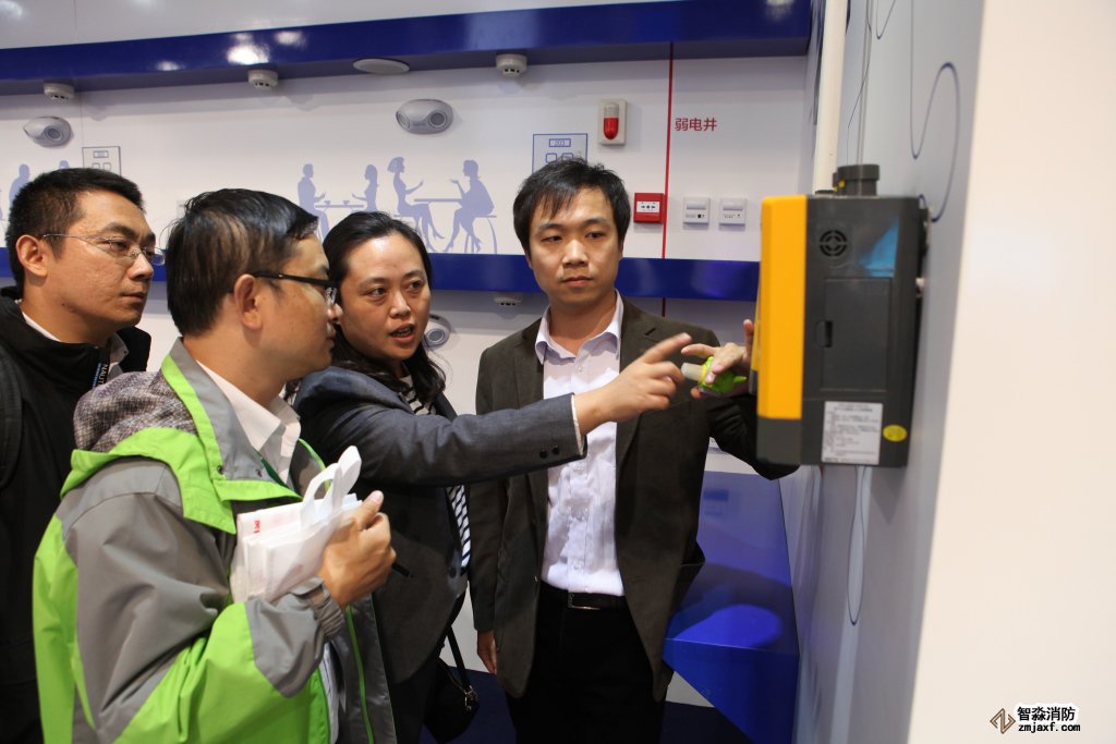 參觀者向技術(shù)人員了解海灣消防遠(yuǎn)程監(jiān)控管理系統(tǒng)