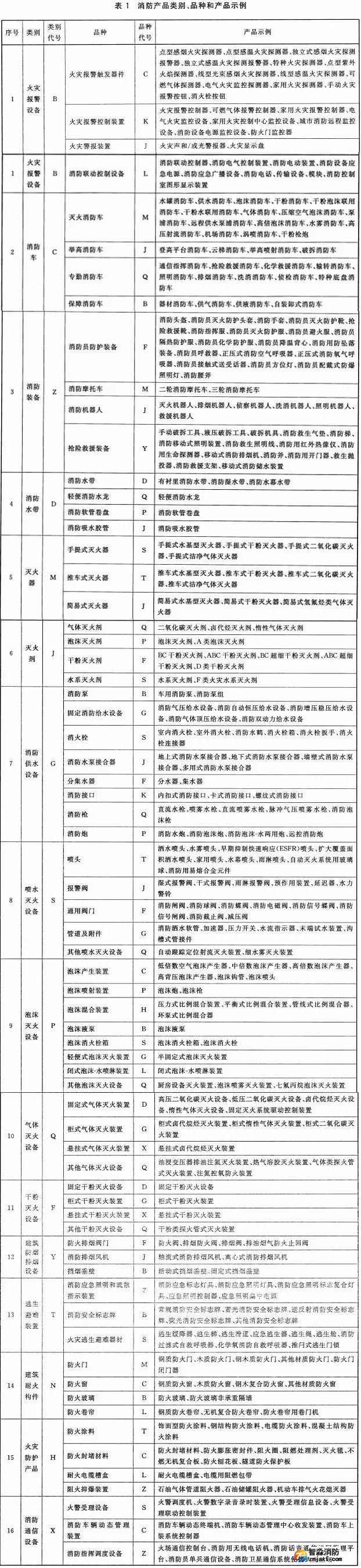 ③ 表1中未包含的消防新產(chǎn)品,其類別和品種代號(hào)可由產(chǎn)品歸口管理部門具體規(guī)定。