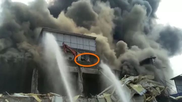 廠(chǎng)房頂部一架挖機(jī)上兩名施工人員被困樓頂,消防人員進(jìn)入火場(chǎng),對(duì)被困人員進(jìn)行施救。