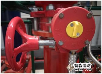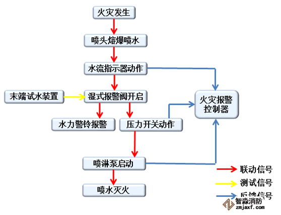 而發(fā)出聲光警報(bào)顯示火災(zāi)區(qū)域。同時(shí)由于濕式報(bào)警閥的開啟,使一部分水流入報(bào)警管路,通過延時(shí)器延時(shí)后水力警鈴發(fā)出報(bào)警鈴聲,同時(shí)壓力開關(guān)動(dòng)作向火災(zāi)報(bào)警控制器發(fā)出反饋信號(hào),火災(zāi)報(bào)警控制器通過邏輯關(guān)系啟動(dòng)噴淋泵。