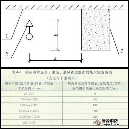 · 當(dāng)噴頭濺水盤高于附近梁底或?qū)挾刃∮?.2m的風(fēng)管、排管、橋架腹面時(shí),噴頭濺水盤高于梁底、風(fēng)管、排管、橋架腹面的最大垂直距離應(yīng)符合下表的規(guī)定: